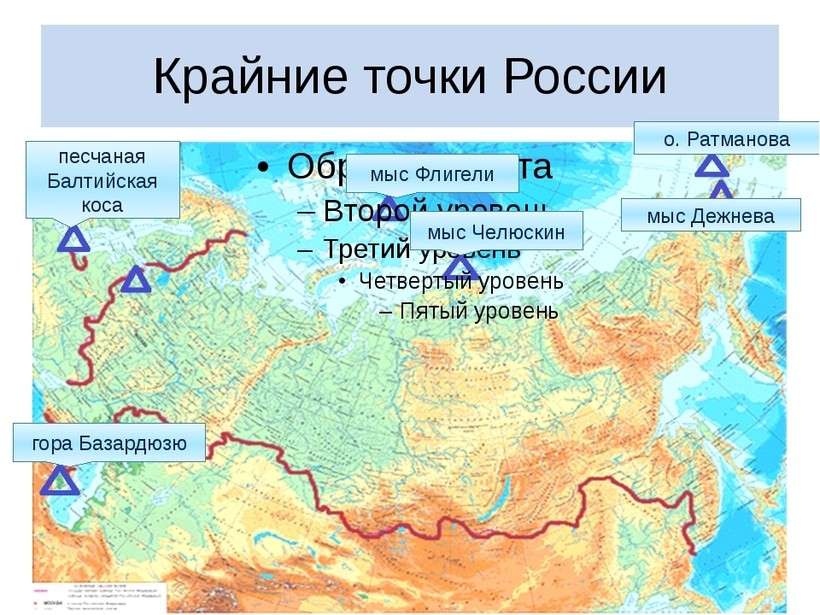 Часто можно услышать фразу: «Отправился на край света». Смысла тут немного, планета-то круглая. А вот найти край России – это запросто. Даже не один, а целых четыре края, если уж быть совсем точным. Если еще точнее – эти края по-научному называются крайними точками. Сейчас расскажу, где конкретно они находятся.