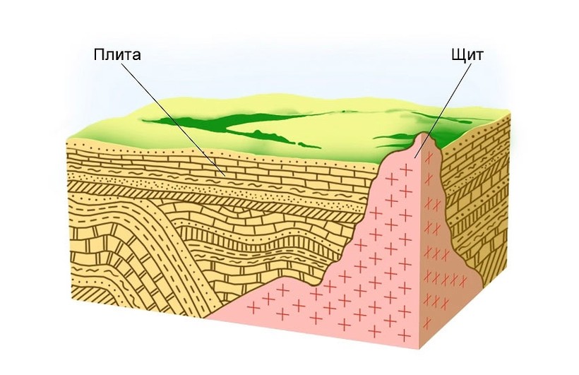 - осадочный чехол — он сложен молодыми осадочными породами.
