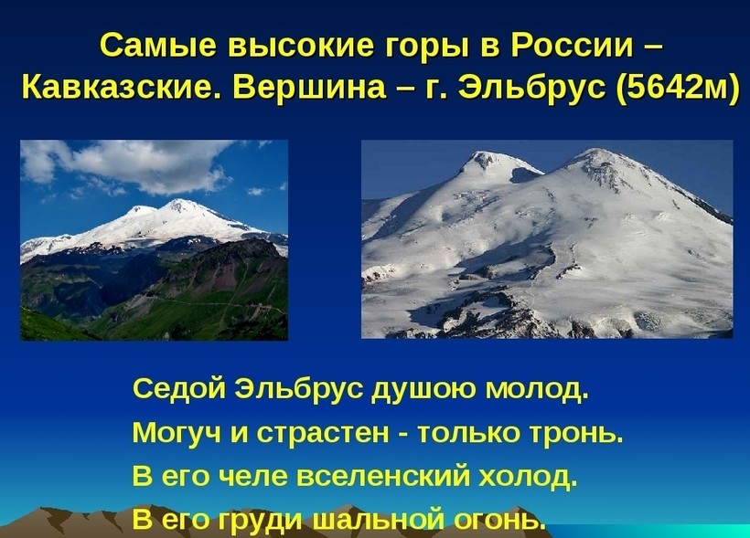 Самыми высокими горами России и всей Европы являются Кавказские горы. Высшая их точка - гора Эльбрус, которая имеет высоту 5 642 метра. Она расположена на границе между Европой и Азией и входит в состав Большого Кавказа. Эта уникальная гора входит в список самых высоких мировых вершин («Семь вершин»). На ее склонах берут начало большие и полноводные реки (Кубань, Малку, Баксан). Кавказские горы считаются относительно молодыми, потому что они образовались в эпоху альпийско-гималайской складчатости.