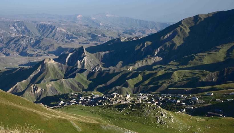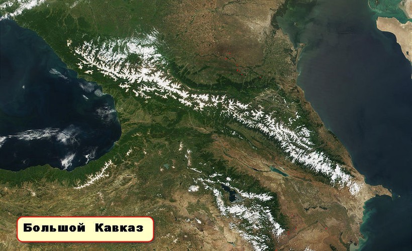 Кавказский хребет располагается между Каспийским и Черным морем. Его протяженность достигает 1200 километров.