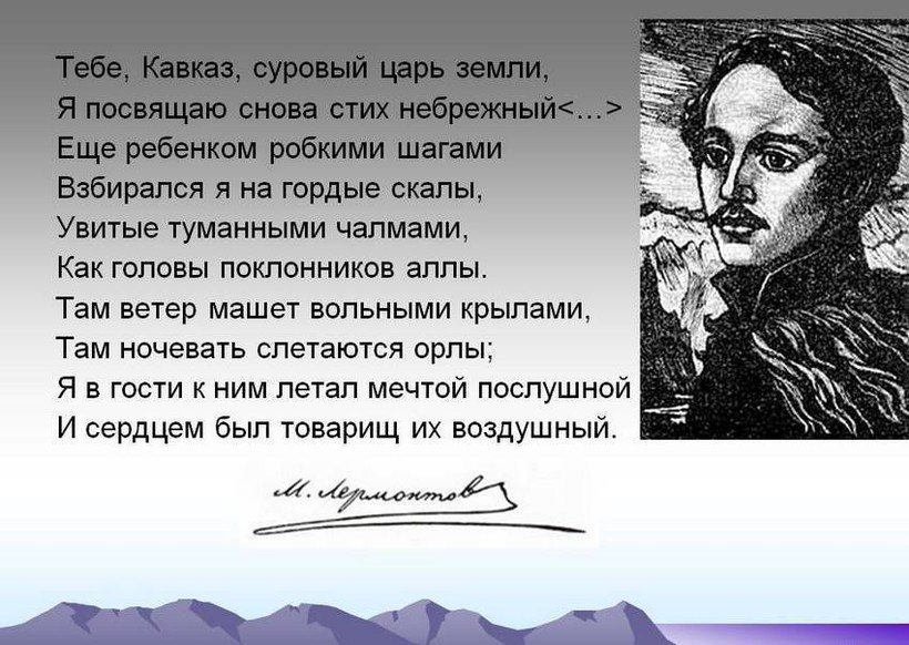 - Лермонтов — «Кавказ! Далекая страна!»;