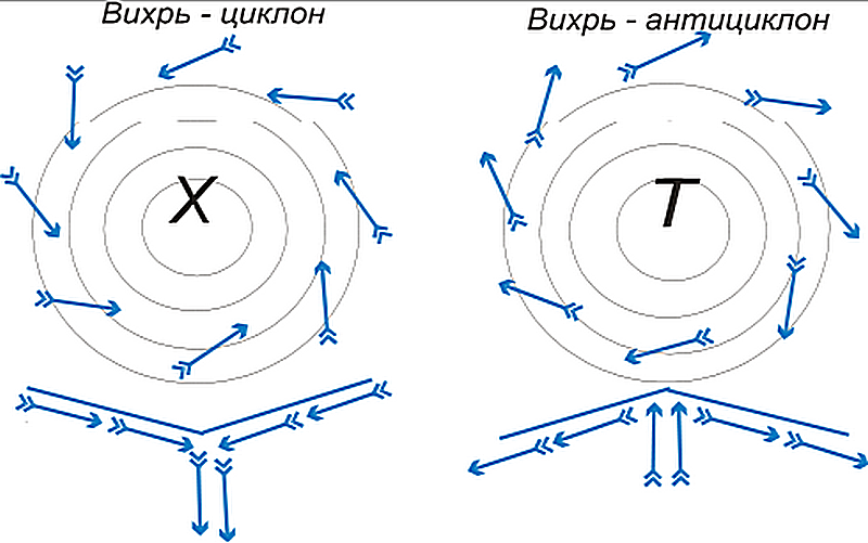 - в Северном полушарии направление у циклона – против часовой стрелки, а у антициклона, наоборот, – по часовой стрелке;