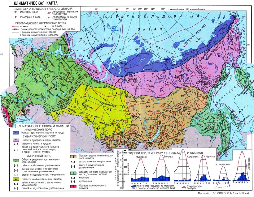 - Восточная Сибирь — резко-континентальный климат (амплитуда еще выше, достигает максимума;);