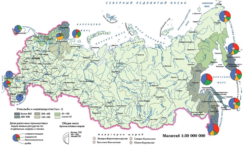 Это в основном тихоокеанские моря — Японские и Охотское. Их поверхностные слои отлично прогреты и освещены, поэтому фауна многообразна. Кроме того, рыболовство крайне развито в Баренцевом море — оно самое теплое из морей на севере Евразии, поэтому богато морскими обитателями.