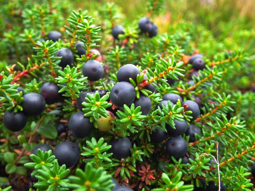 Менее известная ягода болот – водяника. Она не такая вкусная, но зато содержит много жидкости – съев горсточку таких ягод, можно даже напиться. Узнать ее можно по сходству с черникой – она такого же насыщенного темно-синего цвета.