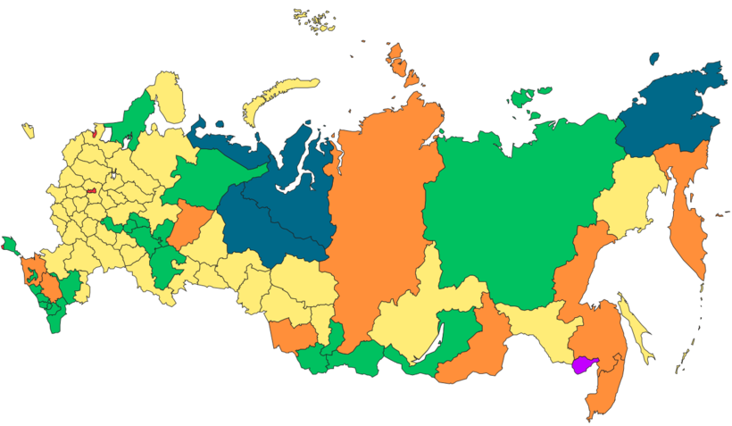 Субъекты - это единицы верхнего уровня территориального распределения. На данный момент Россия состоит из 85 субъектов. На картинке можно увидеть, что зеленым цветом обозначены Республики (22: Адыгея, Бурятия, Ингушетия и так далее.) , красным - города Федерального значения (3: Москва, Санкт- Петербург, Севастополь), оранжевым - края (9: Алтайский край, Камчатский край, Краснодарский край, Пермский край), розовым - автономная область (Еврейская АО), желтым - области (46) и синим - автономные округа (4).
