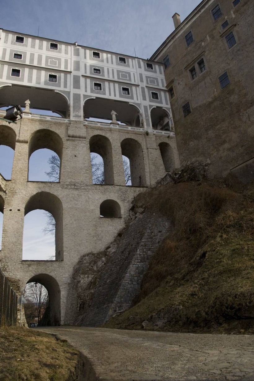 - Крумловский замок. Он в городке очень занятный и неоднородный. Любопытно, что его новая часть, буквально вырастающая из скалы, смотрится на несколько порядков брутальнее средневекового Градека (дословно — зАмочек, маленький замок), стены которого сейчас богато расписаны. В Крумловском замке запоминаются отдельные элементы вроде уникального Плащевого моста, башни Градека или Медведевых ям, в которых можно увидеть живых мишек, но вот цельного впечатления он не производит. Так как мы были с экскурсией, из внутренних аттракционов замка я поднялся только на упомянутую башню Градека. Кстати, внутри она выглядит на порядок более сурово, чем снаружи, ну а возможностью посмотреть на старый город с высоты я всегда рекомендую не упускать.