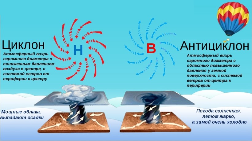 - движение потоков воздуха — от периферии в циклоне и наоборот в антициклоне;