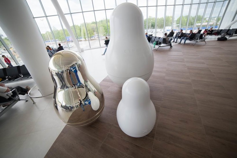 Я живу в Нижнем Новгороде, и, как и в любом уважающем себя миллионнике, у нас есть аэропорт. Называется "Стригино", потому что расположен в пригороде с таким названием. Совсем до недавнего времени аэропорт был маленький и старый, так что туристы фотографировались на его фоне, как с достопримечательностью советской эпохи. Но пару лет назад город поднапрягся, нашёл инвесторов и появился большой новый терминал (а старый закрыли). Теперь на входе в аэропорт вас встретит вот такое интерактивное панно.