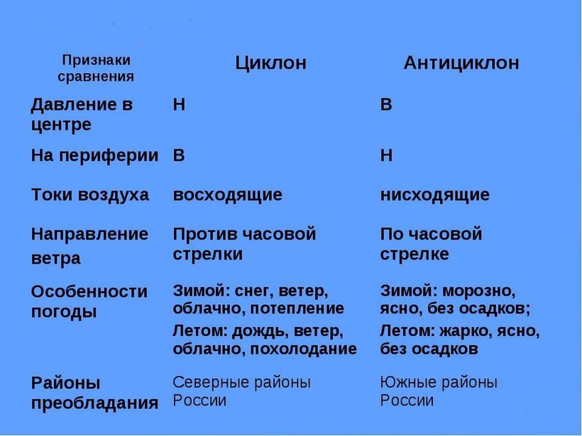 Все природные ненастья заносятся к нам потоками ветра. Такие потоки имеют вихревую форму. Ясно, что вихрь – это закрученный поток воздушных масс. Он может быть направлен только лишь по окружности. Перемещение воздуха в центр завихрения против часовой стрелки называют в северном полушарии циклоном, по часовой стрелке от центра (в том же полушарии) – антициклоном.