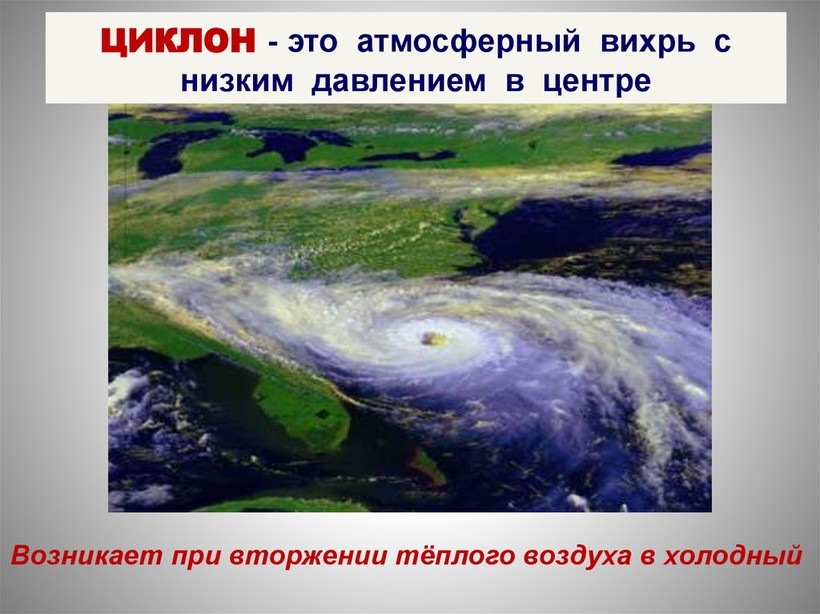 Циклон – это область сниженного давления атмосферы в его центре, поэтому воздух и устремляется именно туда. Циклон притягивает осадки, характеризуется сильным порывистым ветром и низкими температурами.
