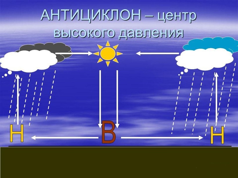 Антициклон – это вихрь с направленным от его центра течением воздуха. Движение воздуха в этом течении - по часовой стрелке. По центру антициклона высокая область давления воздушного столба. Исходящие вверх потоки воздуха антициклона теплые, поэтому образуют ясную, без осадков, погоду.