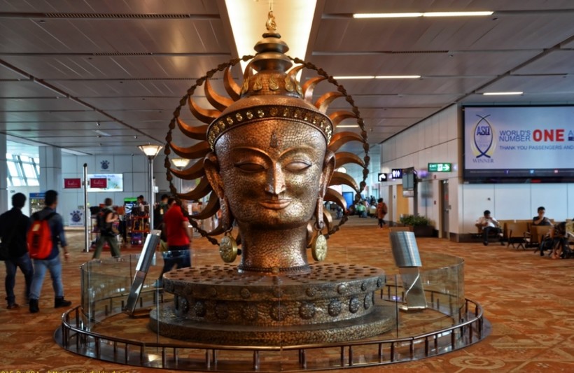 Прилетел и изучил схему аэропорта. Он какой-то изогнутый и состоит из трех терминалов: компактный внутренний, большой международный и отдельный для хаджа. В международном терминале самое неожиданное, пожалуй, это оформление — красивые панно на буддистскую и индуистскую тематику, голова Будды и какие-то гигантские руки в стене, они изображают местные жесты. Нигде больше такого не видел.