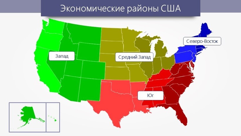 Со второй половины ХХ века Америку разделили на 4 больших района: Юг, Запад, Средний Запад и Северо-Восток.