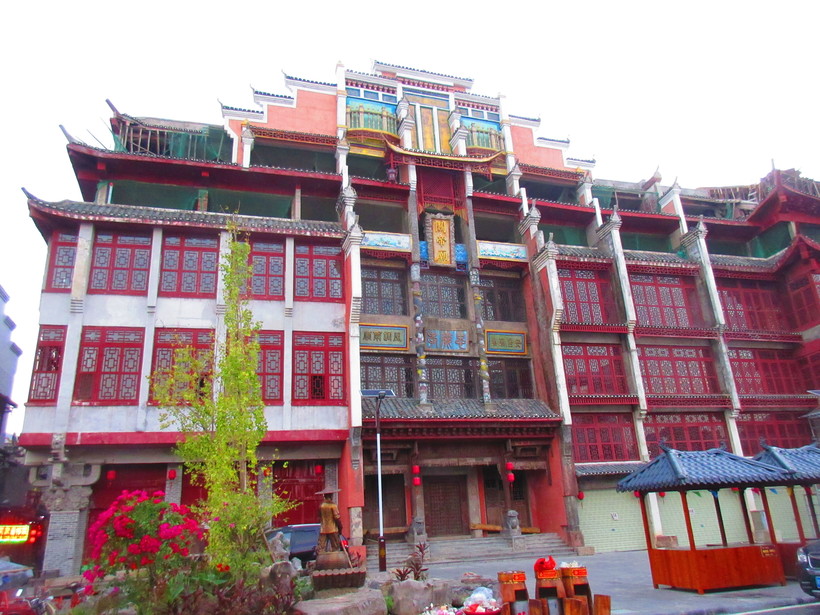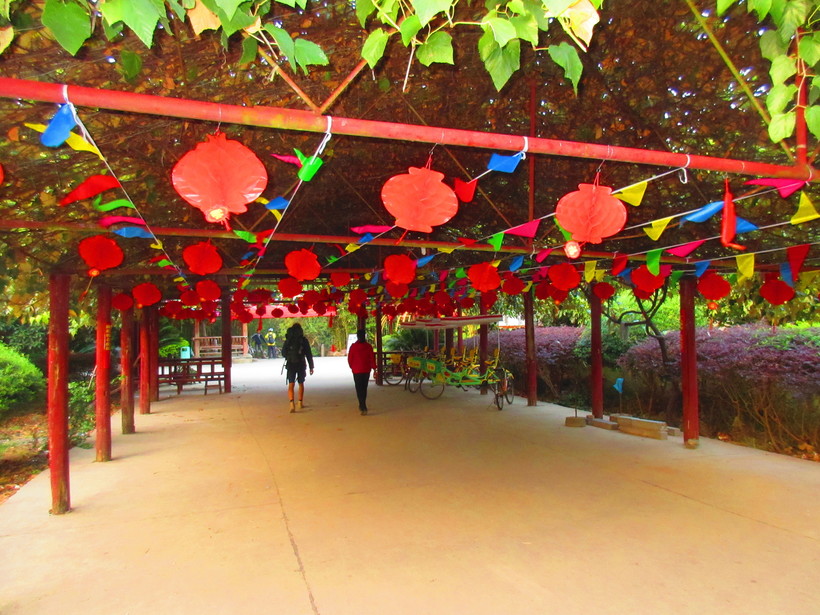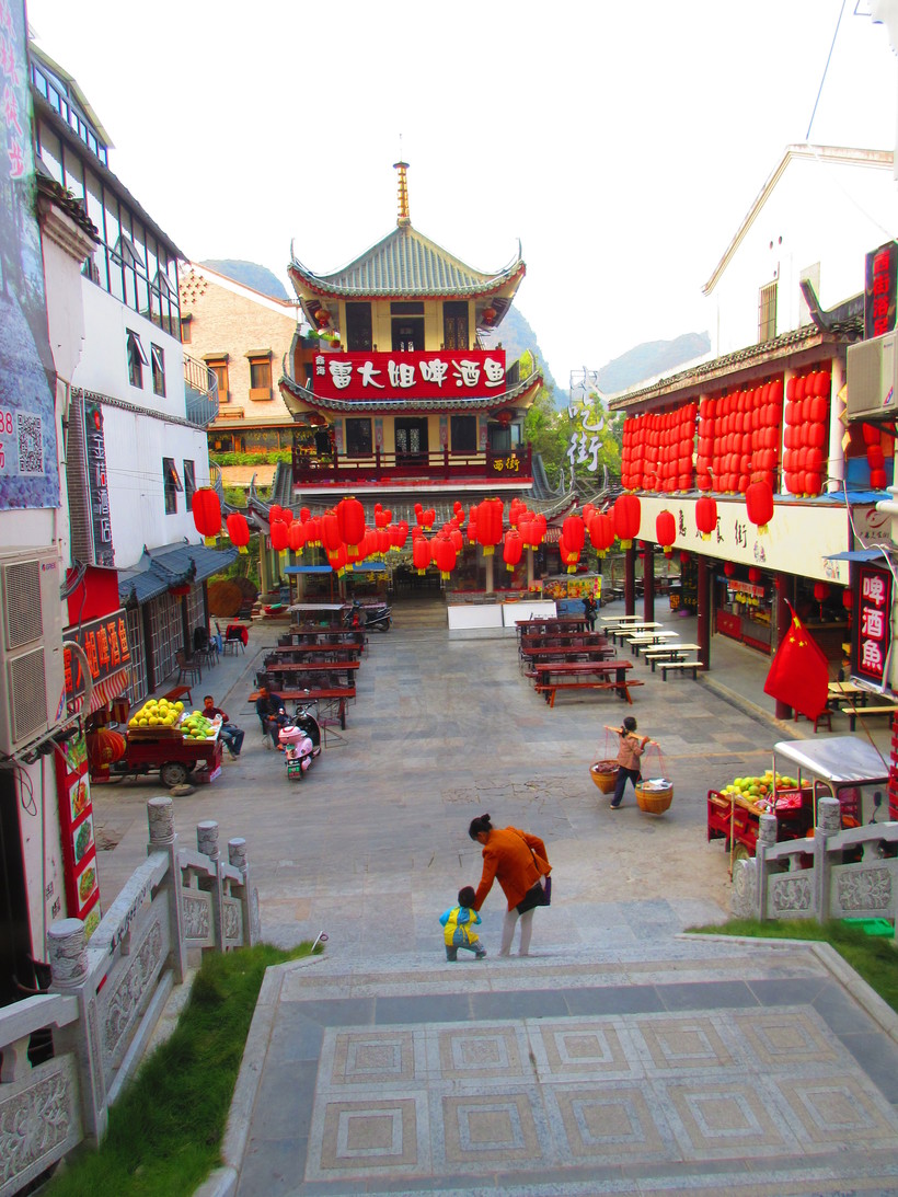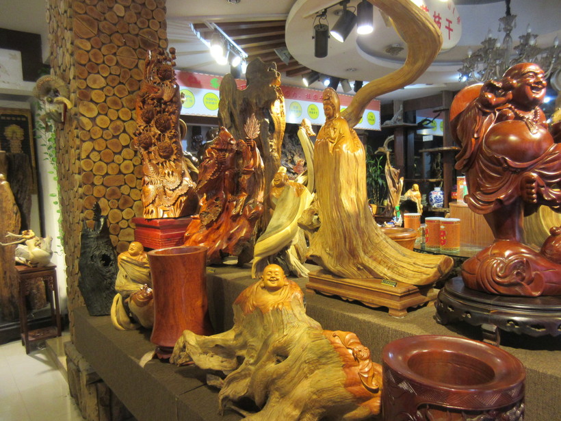 Если бы не наш вечный спутник в Китае (смог или дымка), было бы гораздо красивее. Целый час мы сидели вертя головой, настолько изумительным был вид. Если есть деньги, можно покататься на лодке. Рекомендую попробовать корень лотоса, который продают старенькие бабушки, водянистый и слегка сладковатый, хорошо освежает в жаркую погоду. Приехав в Яншо, распрощались с нашими спутниками и направились в центр, посмотреть чем живет поселок. Главная туристическая улица пестрит сувенирными и гастрономическими лавками, кафешками и ресторанами. Можно найти еду на свой вкус и кошелек. Для любителей деревянных изделий и поделок, есть шикарный магазин с широчайшим ассортиментом, только цены отпугивают дороговизной.