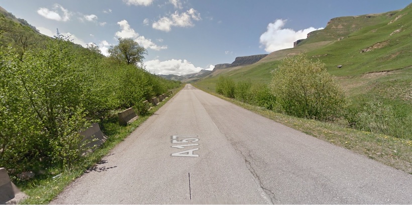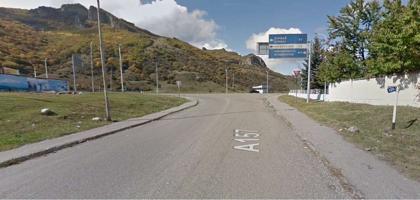 Первая часть маршрута идет по А157, которая начинается прямо возле аэропорта. Пейзаж интересный, хоть до высоких гор еще километры, но по пути есть на что посмотреть. Чем ближе горы, тем дорога становится более закрученной, а пейзажи величественней. В конце концов А157 упирается в А155, от перекрестка до Домбая еще 67 км.
