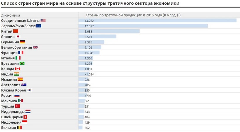 Как видно из этого списка, ни одна из этих отраслей не производит самостоятельный продукт. Согласно данным того же фонда, единственной страной, которая намного превосходит остальных по количеству продуктов этого сектора, являются США. И действительно, там много чего завязано на этом секторе. Многим даже не понятно, почему, например, обвал котировок на Нью-Йоркской бирже, где, по сути, торгуют бумажками и цифрами, может привести к общему спаду мировой экономики.