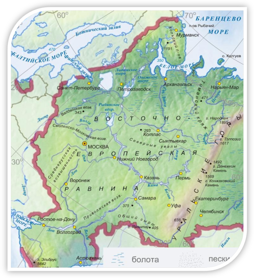 Прежде чем говорить про процессы, которые определили внешний облик равнины, стоит рассмотреть их результаты. Анализируя изображение в атласе, я заметила, что все возвышенности на юге тянутся субмеридиально двумя цепочками: первая — Среднерусская, Смоленско-Московская и Валдайская возвышенности, вторая — Приволжская, Общий Сырт.