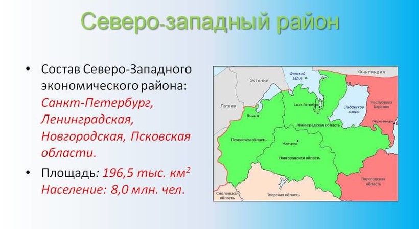 В моей памяти почему-то отложилось, что Северо-Западный экономический район — это прежде всего логистический центр и перевалочный пункт на торговом пути с Западной Европой. Однако, мне известно, что данный район славится своим высокотехнологичным производством и развитым машиностроением. Пищевая промышленность региона работает с привозным сырьем только частично.