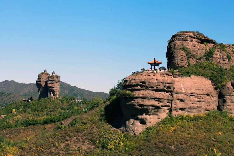 Перед возвращением в Пекин мы решили посетить еще одно место, 双塔山 (гора двух пагод). Главный "атракцион" - это две горы, сформировавшиеся благодаря выветриванию почвы, на вершине каждой из которых находятся пагоды.Сейчас до этих пагод могут добраться только белки или скалолазы, у которых есть разрешение. Вся территория это большой парк, огибающий гору. Мы пройти его не успели, так как внезавно начался сильный дождь с ветром. Зато такой поход запомнился нам надолго. Входной билет 50 юаней.