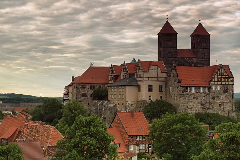 Есть в Кведлинбурге и замок, стоящий, как и положено старинному замку на горе, называющейся Шлоссберг и господствующей над окружающей его местностью. Вид с замка потрясающий – с одной стороны видны черепичные крыши старого города, с другой стороны – живописные поля, за которыми просматривались вершины горного массива Гарца.