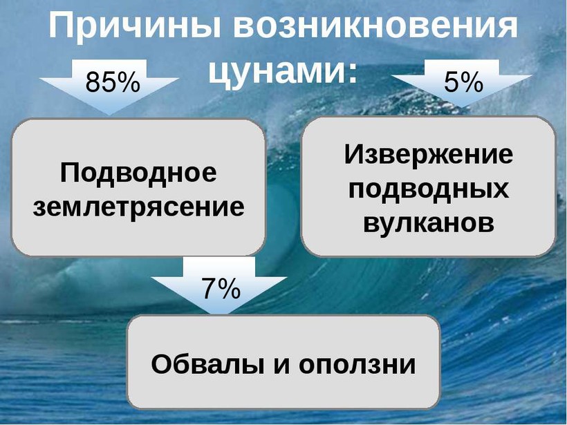 В 85% случаях это геологическая активность, что обусловлено тектоническими процессами в пределах Тихого океана — резкий подъем участка дна либо, напротив, его опускание. Второй по значимости причиной — до 8%, являются оползни. Извержение вулкана становится причиной в 5% случаях, однако по эффекту ничем не уступает землетрясениям. Человеческий фактор, например, глубоководные ядерные испытания, с небольшой долей вероятности также может вызвать разгул стихии. Существует еще одна причина — падение метеорита, однако вероятность подобного крайне мала. Бывает, что явление спровоцировано сочетанием указанных факторов, и в этом случае разрушительная сила цунами возрастает в несколько раз. Что касается параметров волны, то, как и любая другая, она обладает следующими характеристиками: