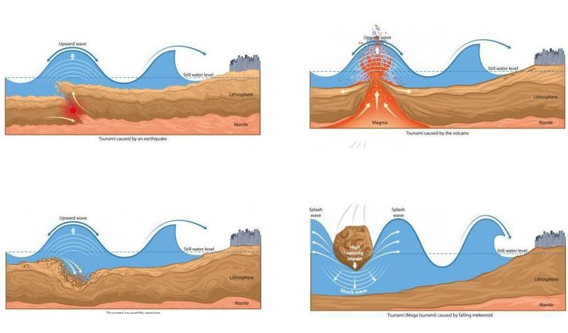 Обычные волны, вызываемые ветром, очень отличаются от цунами. Ветер задевает только верхние слои воды, но есть сила гораздо мощнее. Во внутренних слоях Земли, под земной корой, постоянно возбуждаемая природной радиоактивностью энергия непрерывно передается в другие слои и иногда провоцирует столкновение тектонических плит и землетрясения. Смещение участка земной коры приводит к движению столба воды, что, в свою очередь провоцирует волну. Кроме землетрясений цунами могут спровоцировать: