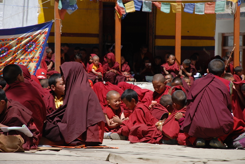 Юные воспитанники тибетского монастыря на переменке после службы