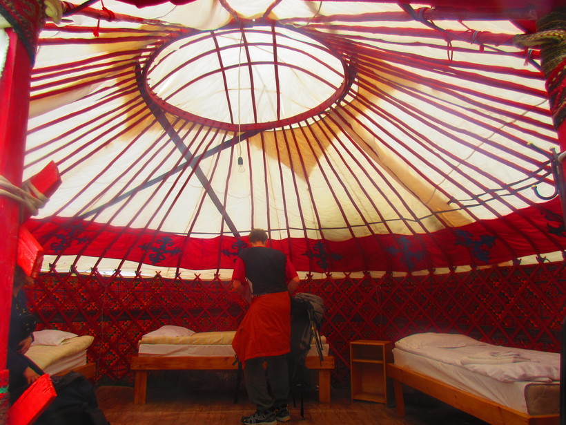 По прибытии в хостел мы узнали, что цена неожиданно возросла, как объясняла администрация, это связано с курсом доллара, на котором основана цена бронирования. Но мы не сдавались и добились той цены, которая была указана в нашей информации по бронированию. Уладив разногласие, нас заселили в юрту с четырьмя кроватями, если бы нас было четверо, то получилось бы еще выгоднее. Юрты находятся на территории хостела, оборудованы специальные беседки со столами для больших компаний, где можно приятно посидеть за трапезой или настольными играми. В душ и туалет приходилось ходить внутрь здания. Вообще в мае ночевать в юрте оказалось удовольствием ниже среднего, ночь была неожиданно холодной и все спали одетые, а утром воздух прогрелся и мы вспотели. К тому же это не классическая юрта - мебель,пол и лампочка свисающая в самом центре, губят всю атмосферу. Тем не менее место очень популярно у англоязычных иностранцев.