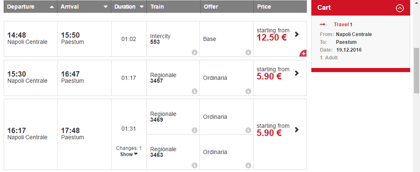 Добравшись до вокзала, вам останется только купить билет на поезд. Однако я хочу обратить ваше внимание на то, что на самом деле поезда в Пестум ходят, не очень часто, график постоянно меняется и я вам не советую пренебрегать расписанием, которое можно посмотреть вот здесь. Еще раз повторю, смотрите расписание поезда иначе просидите на пустой платформе битый час. Время в пути занимает от 1 часа до 1 часа 20 минут. Ниже я приложу скриншот расписания на 19.20.2016, чтобы вы сами все наглядно увидели.