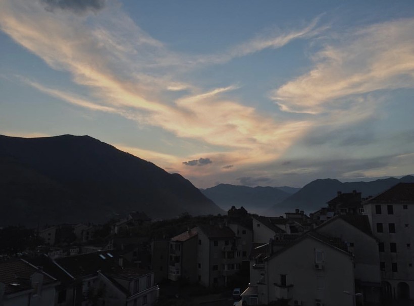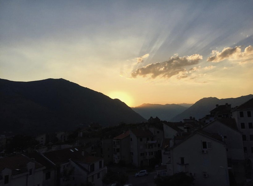 Нежно полюбился мне и вид на Доброту с нашего балкона: ряд одинаковых, прижавшихся друг к другу аккуратных домиков и горы, горы, горы. Я не уставала фотографировать этот вид, то яркое дневное солнце выглядывает из-за гор, а то над ними повисли розово-голубые закатные облака. И каждый раз всё тот же вид будто очаровывает тебя по-новому.