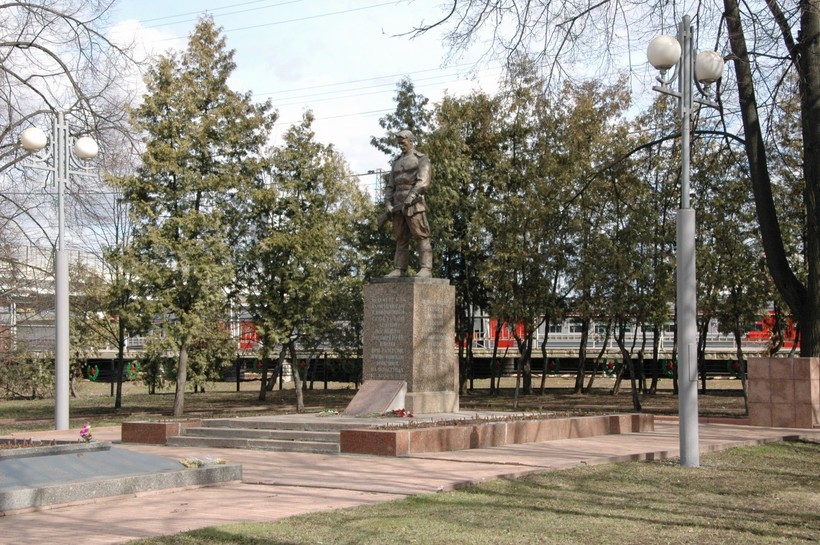 Небольшой сквер с цветочными клумбами и солдат с опущенным автоматом на гранитном камне, там же высечены имена одних из командиров. Воин призывает просто помолчать и помянуть тех, кто сражался за нашу свободу.