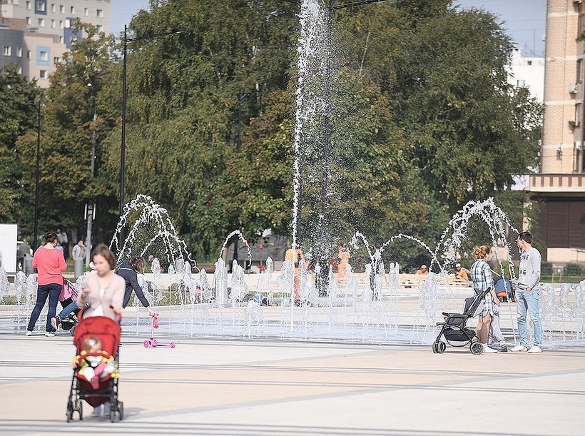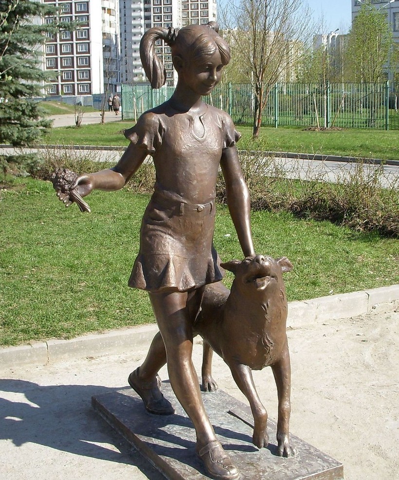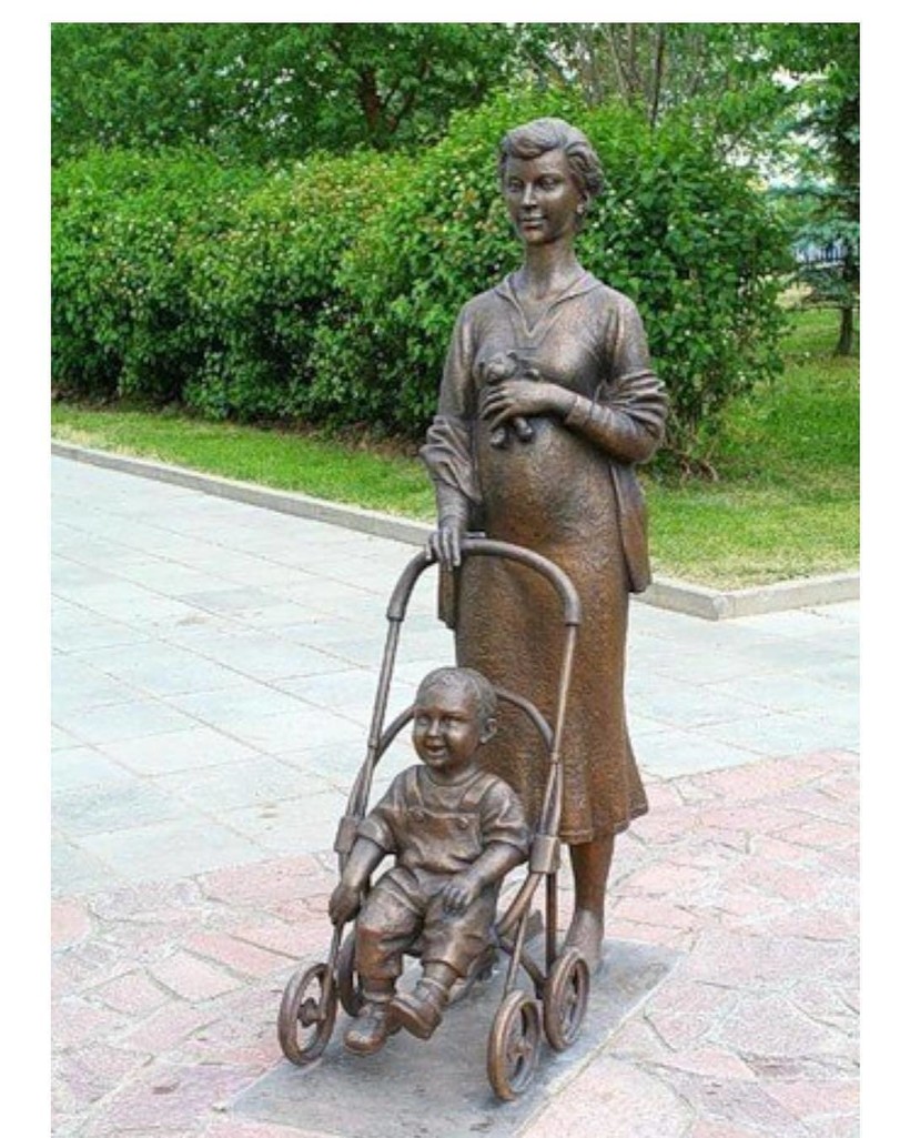 Вообще, здесь расположена большая новостройка, я бы даже сказала, целый микрорайон. И прямо перед ним широкий пруд, около которого проходит то ли аллея, то ли маленький парк, где высажено небольшое количество деревьев. Само название этой картины – «Отдых в городе». И правда, тут много молодёжи, новоиспеченных мам, даже мужчины успевают рыбачить. И как раз здесь установлены скульптуры мамы с коляской и девочка с собакой.