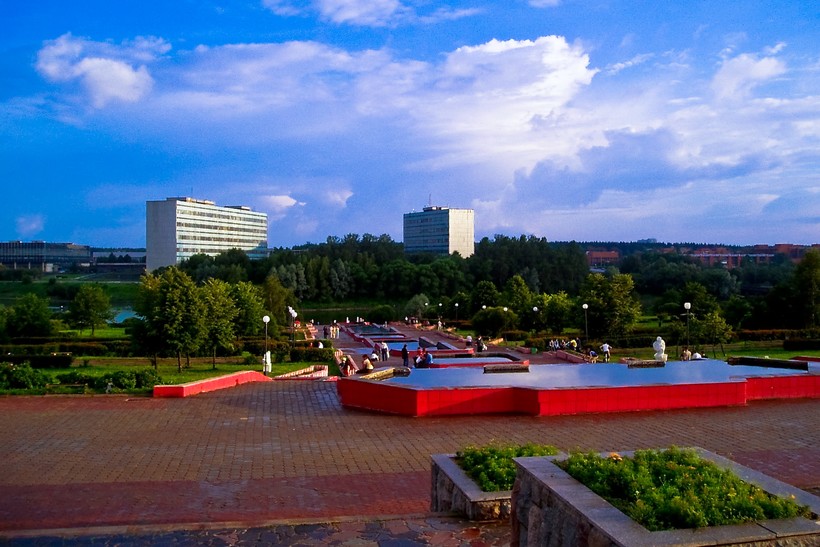 Я бы даже сказала, что это настоящий лес, особенно, когда смотришь с краю. Очень много деревьев, клумб, газоны ровно подстриженные. Ступенчатая аллея, по середине которой бассейны, выложенные мозаикой в фиолетовых или багровых тонах, всё это заканчивается тремя фонтанами и переливается на солнце, ну как вам пейзаж? Офигенный! Ну, если вам мало воды, на берегу вы можете повосторгаться озерной гладью. Рядом можно наблюдать дом Культуры и огромный жилой дом «Флейта», который виднеется даже внизу у берега пруда.