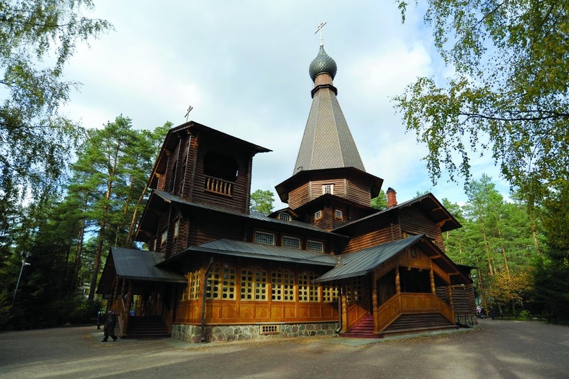 И очередной храм деревянный. Как высокий терем причудливой формы. Каждая церковь своей неповторимой формы, мне это очень понравилось и запомнилось. Возможно, среди паломников это место очень известно, так как именно здесь находится могила святого Серафима. Внутри тоже всё деревянное, особенно иконостас резной. Рядом с церковью небольшая тоже деревянная часовня в честь Серафима.