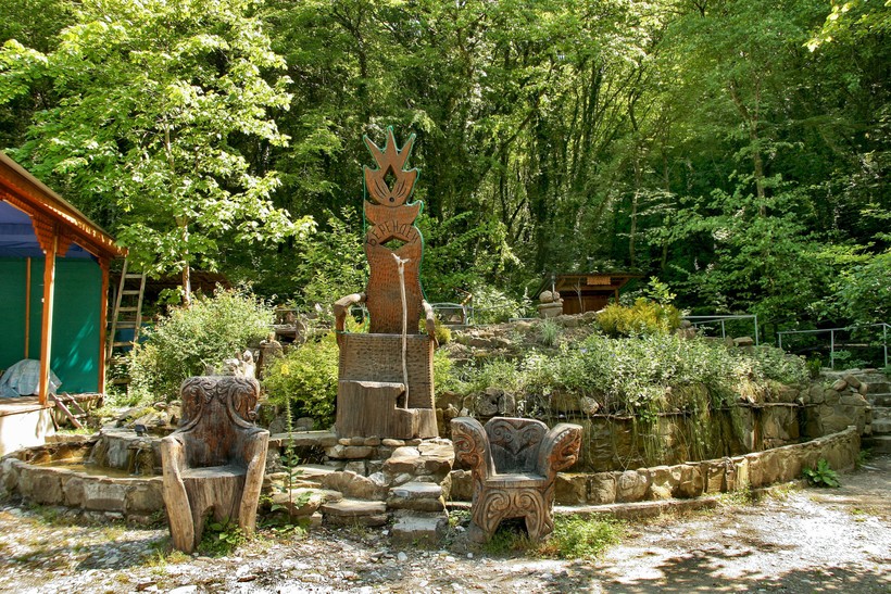 Это просто чудесная сказка! Городок находится в лесу, встретили нас деревянные ворота. Там есть и дольмены, и водопады, целых 7 штук! Всё продумано до мелочей: прохождение по деревянным лестницам, которые переплетаются с верёвочными дорожками. Есть пруд, в котором посетители сами ловят форель и могут тут же приготовить в кафе, естественно, в цену билета это не входит. Но мы перекусили до парка, поэтому, пошли дальше. Лес переплетался с горами, озёрами, встречались сказочные деревянные герои, проходишь по камням-великанам. И вот трон Берендея! У нас прогулка заняла около часа, но это стоит того всего за 100 рублей!