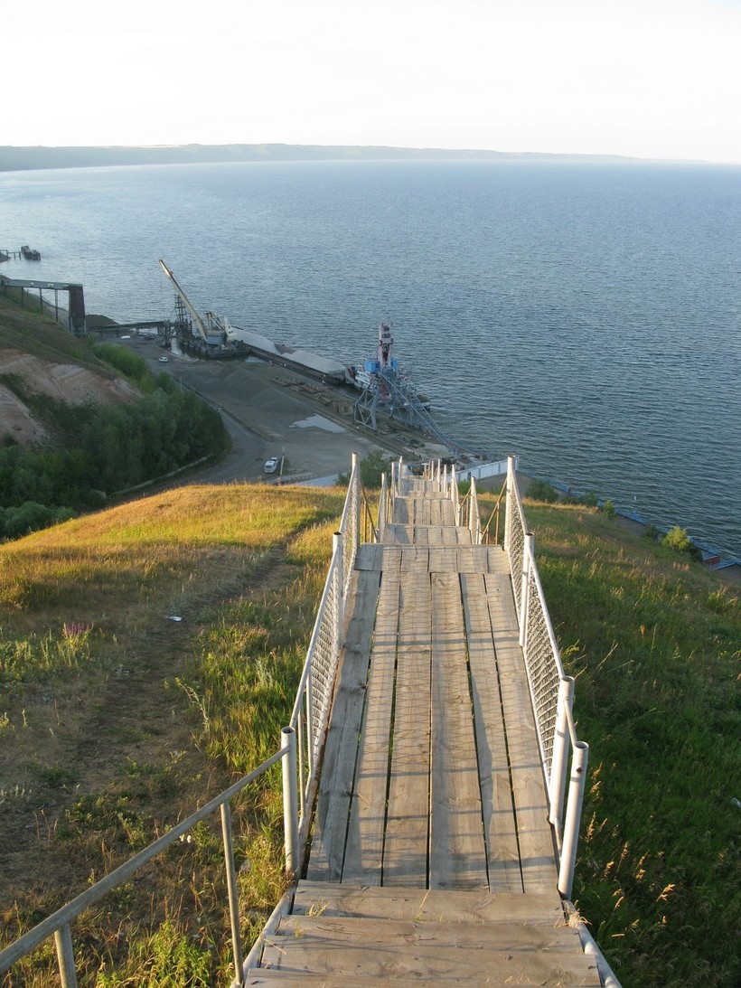 Начали мы со Смотровой площадки, от которой ведется длиннющая деревянная лестница вниз к реке Волга.