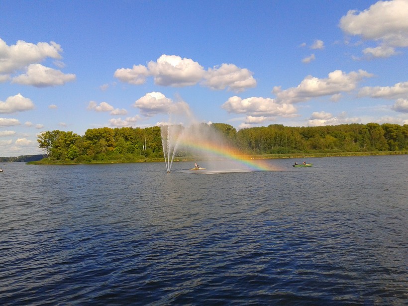 И не только сама забавная скульптура, сколько местечко на озере Сенеж. Живописная природа, есть песчаный берег, где можно купаться и рыбачить, но мы не рискнули, так как был ещё май. От берега идут ухоженные тротуарные дорожки, скамеечки, железное дерево, на которое молодожёны подвязывают ленточки. Кстати, здесь можно романтично провести время – взять лодочку в прокат, по-моему, 300 рублей в час и наслаждаться природой, более спортивный – катамаран. Ну а самым ленивым – прогулка на пароме, займет это 40 минут, по стоимости так же.