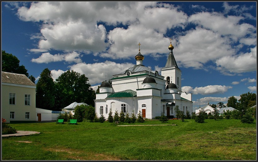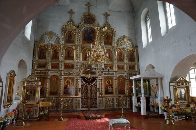 Прежде чем войти на территорию целого комплекса, который огражден крепостью, мы осмотрелись вокруг: «самодельный» парк-сад, по которому можно пройти к речке, здесь очень уютно, даже показалось, что как-то тепло и в холодное время. Мы зашли под святые ворота и даже тут раскинулся великолепный сад, и сразу нас встречает храм Преображения Господня. Все храмы здесь белые и выполнены в едином стиле, вот и колокольня с отдельным входом и храм Александра Невского. В сам монастырь нас не пустили, а вот в Спасо-Преображенский храм мы зашли. Именно там можно найти иконы Варвары и Тихвинской Пресвятой Богородицы. Внешне мне храм показался большим, а когда вошли – уютная, но небольшая церковь, даже внутри стены белые.