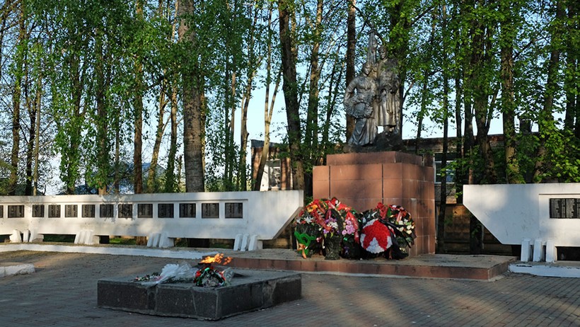 Территория достаточно просторная, всё выложено брусчаткой, сам мемориал длинный, ещё бы, там столько фамилий наших героев, и памятник, перед которым и расположен сам Огонь. Цветов тут немеренно, видно, что люди чтят память постоянно.