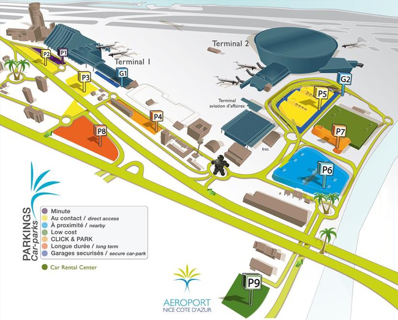 Самый простой и удобный, но далеко не самый дешевый способ добраться до Сен-Рафаэля – взять машину в аренду, однако при этом нужно учесть несколько нюансов. Во-первых, стоит заранее озаботиться получением международного водительского удостоверения, во-вторых у вас с собой должны быть две(!) кредитные карты, разумеется, с деньгами, так как наличные в прокатных конторах не принимают от слова совсем. Франшиза на аренду автомобилей здесь может быть достаточно высокой – от 300 до 1500 евро, сама аренда сроком на неделю обойдется в сумму примерно от 500 евро плюс страховка, стоимость которой зависит от ее вида. Несколько сэкономить можно найдя на просторах интернета скидочные купоны, не пренебрегайте такой возможностью. На схеме ниже ближайший центр проката автомобилей отмечен темно-зеленым, недалеко от второго терминала, сразу за парковкой Р5:
