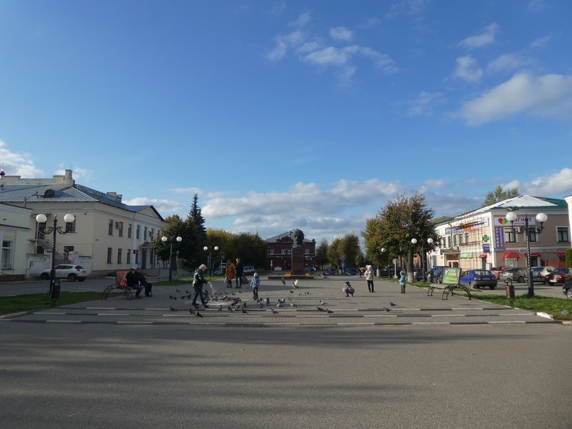 Я ожидала хоть здесь встретить суету или хотя бы нормальное количество людей, но нет, как будто половина населения переехала разом! Кроме магазинов здесь малоэтажные старые дома, высоток я вообще по городу не встретила, середина площади выстлана брусчаткой, одинокий памятник (точнее голова) Ленину и пара лавочек, и всё! Конечно, инфраструктура этого города – большой минус.