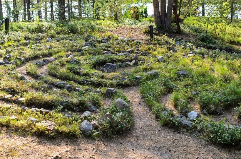 Для этого мы поехали в Кандалакшский лабиринт. Я представляла себе его как в сказке «Алиса в стране чудес», помните, в иностранной экранизации: высокие кусты, по дорожкам надо будет бегать и искать друг друга, но не тут-то было… Мы приехали в реденький лес, в котором выложен камень какими-то кругами или волнами, как будто здесь проводят обряды.