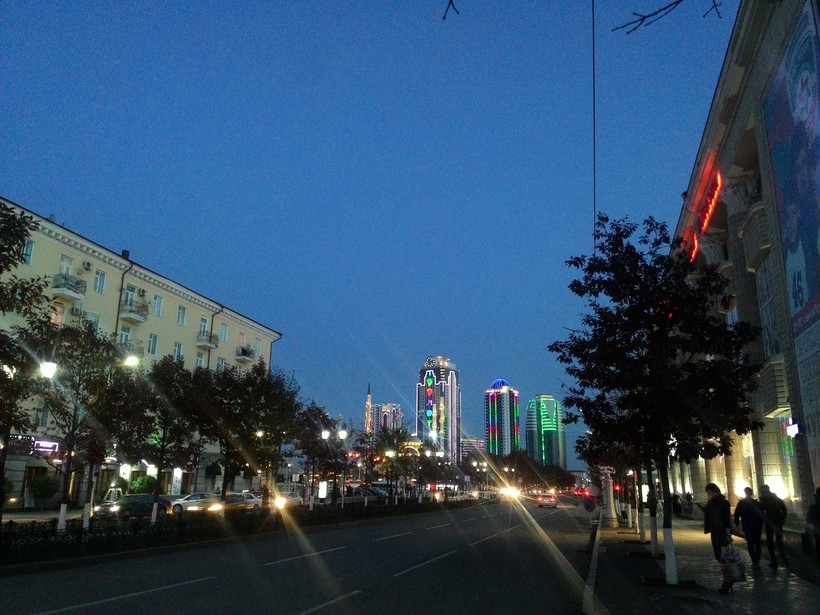 Вечерний город и вид на «Грозный-Сити» радуют глаз множеством неоновых огней, привлекая молодежь, которая к вечеру вся стекается к центру, на главную площадь.