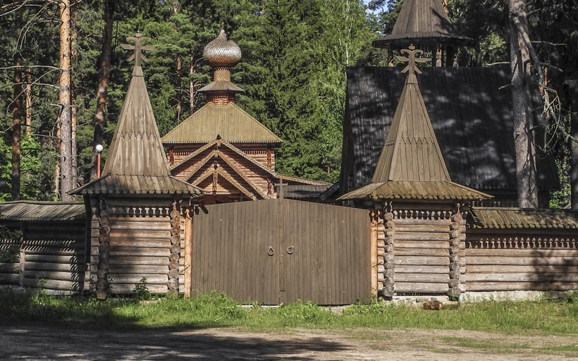 - Храмовый комплекс Смоленской иконы Божьей матери. Он заинтересовал меня настолько, что я сделал около него персональную остановку. Если не знать, что это современный новодел, вполне можно решить, что он построен веке эдак в XVII-XVIII. Доводилось мне видеть современные деревянные церкви, которые выглядят откровенно безвкусно — здесь такого нет, и храмовый комплекс построен по тем же канонам, что и старинные церкви, собранные в Музее деревянного зодчества в Суздале и в комплексе «Витославлицы» под Великим Новгородом.