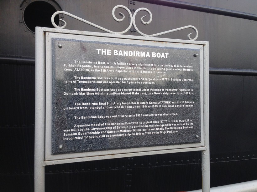Сразу после заезда в город мы наткнулись на то, что хотели посетить в первую очередь - корабль Бандырма, на котором Мустафа Кемаль прибыл со своими сподвижниками в 1919 году 19 мая из Стамбула дабы провести свою первую конференцию по началу освободительного движения. В те годы страна находилась в полной разрухе после поражения в Первой Мировой войне, регионы распались на бэйлики с местными самоуправленцами, султан бежал из страны, а народ пытался восстановить свою жизнь.