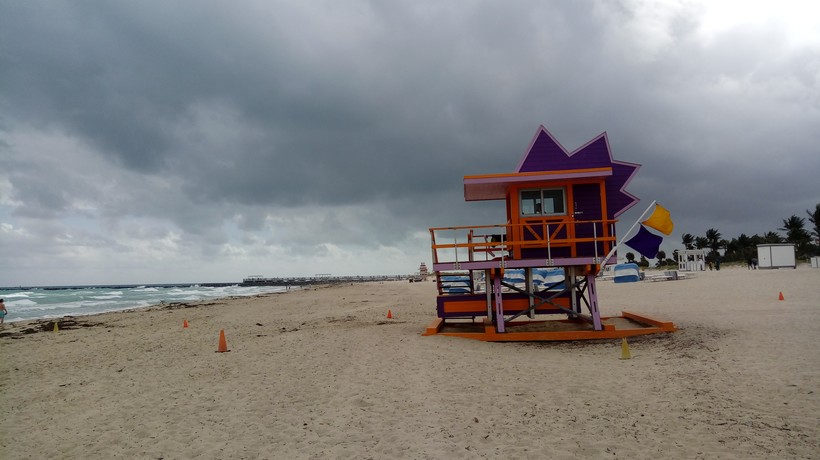 South Beach несколько разочаровал, хотя он считается одним из лучших пляжей. Недоумеваю, почему во многих путеводителях его описывают как роскошный. Длинная песчаная береговая линия, вода чистая за спиной небоскребы. Мне не хватало красоты природы. Разве что спасательные вышки все в том же стиле ар-деко радовали глаз. Очень много людей, шумно.