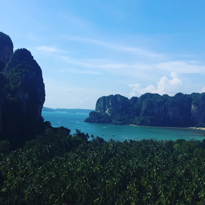 А еще не забудьте отправиться в голубую лагуну. Найти ее не сложно. Тайцы предусмотрительно повесили табличку со стрелочкой, куда нужно идти. Но путь туда не близкий и не легкий. По скалам вверх, а потом по скользким тропинкам вниз к самой лагуне. До нее я не дошла, потому что оценив ситуацию я поняла, что можно там и остаться. К тому же тайцы поставили табличку, что путь туда опасен. Зато вот такой вид открывается, когда поднимаешься вверх.