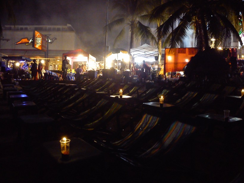 На пляж можно спокойно выходить часов с 7 утра, как это делали мы, к этому времени солнышко еще не очень разогрето, но пляж уже чистый и пустой. Город просыпается, шезлонги появятся под пальмами ближе к часам 12. Или могут вообще не появится, если у тайцев какой-нибудь праздник. Мы так однажды попали в ноябре. Цена на лежаки на целый день вполне подъемная 50-100 батт. Мы не разу ими не воспользовались, обычно раскладывали большое полотенце, брали с собой водичку, этого было вполне достаточно.
