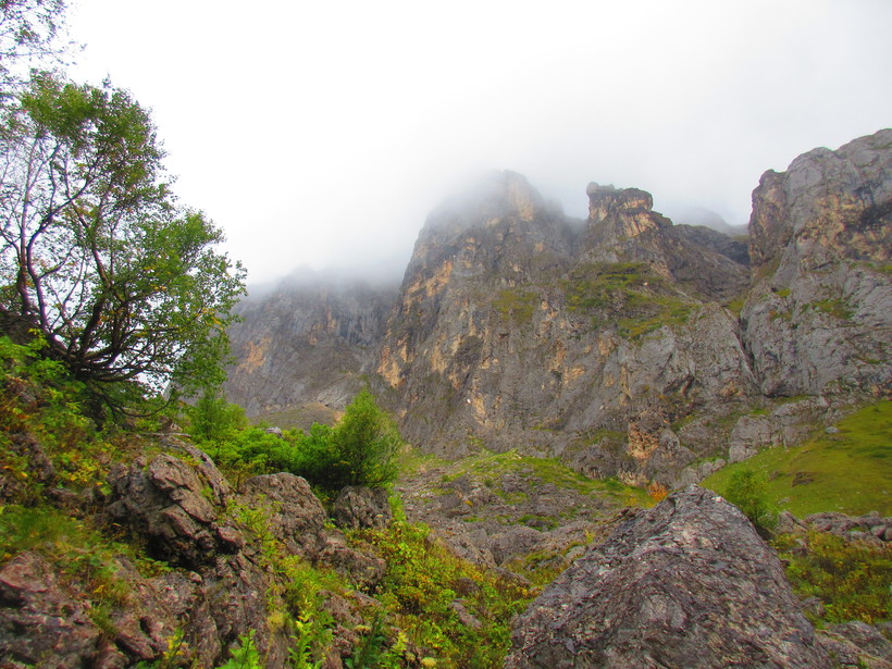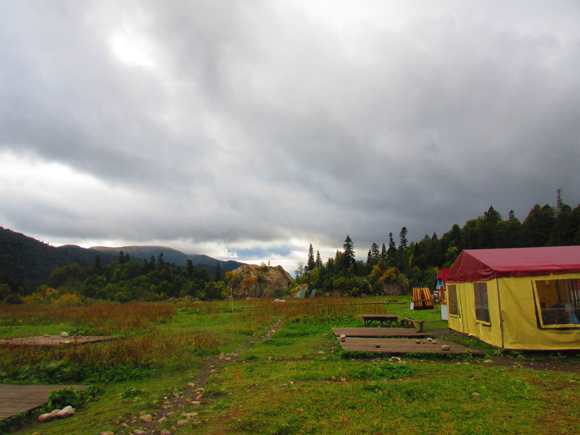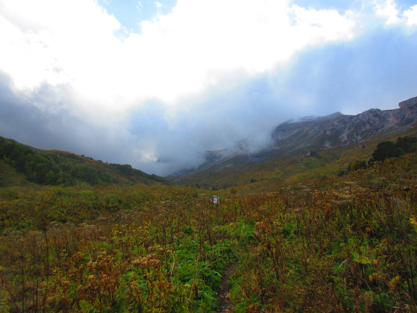 Утром все палаточники разбредаются по своим маршрутом, мы не стали исключением. Изначально мы планировали восхождение на Фишт, но поговорив с вернувшимися оттуда людьми поняли, что без специального оборудования из-за дождей это невозможно. Решили сразу двигать в сторону Бабук-Аула. Омрачало только количество туч из-за которых не было видно верхушек гор, хорошо дождь пока не начинался.